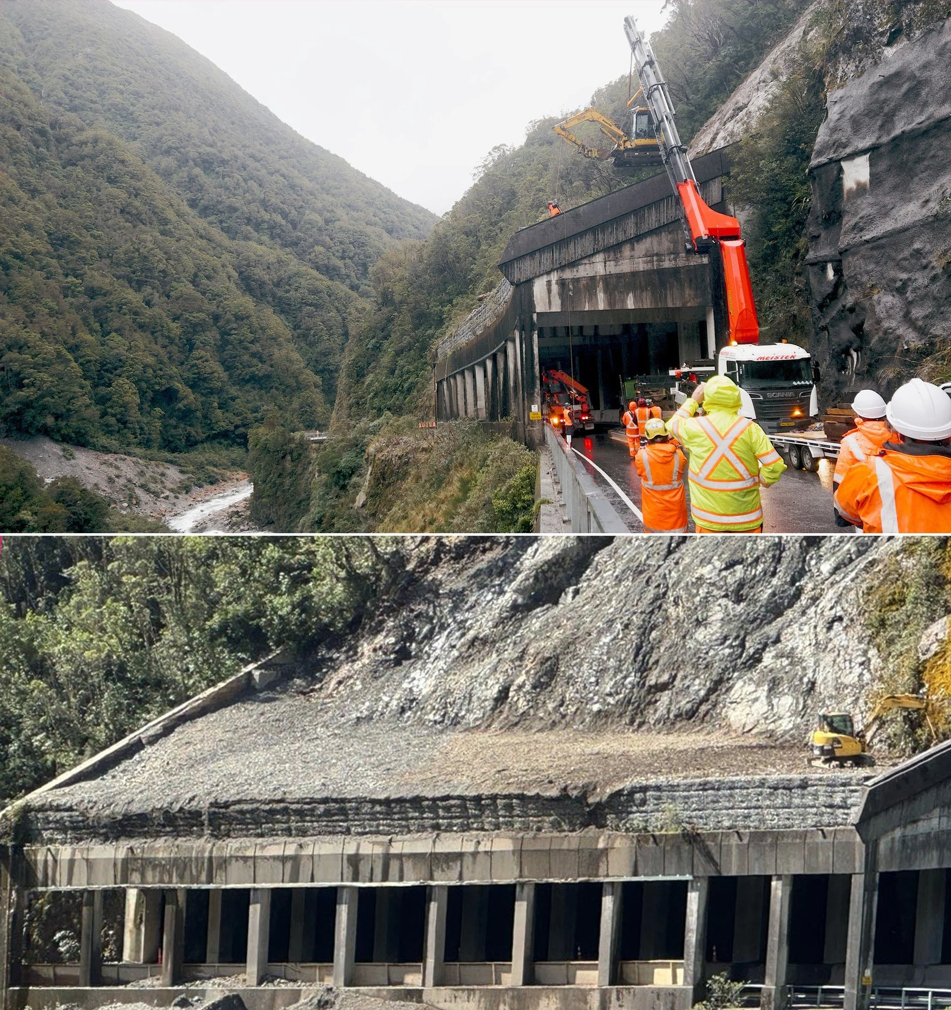Our crane lifted a remote-controlled digger onto the Otira Gorge rockfall shelter (SH73) for New Zealand's first rooftop clearance. Our engineers' and crane operators' preparation—including precision and situation drawings—ensured smooth execution, finishing two weeks early despite harsh weather while keeping crews safe.