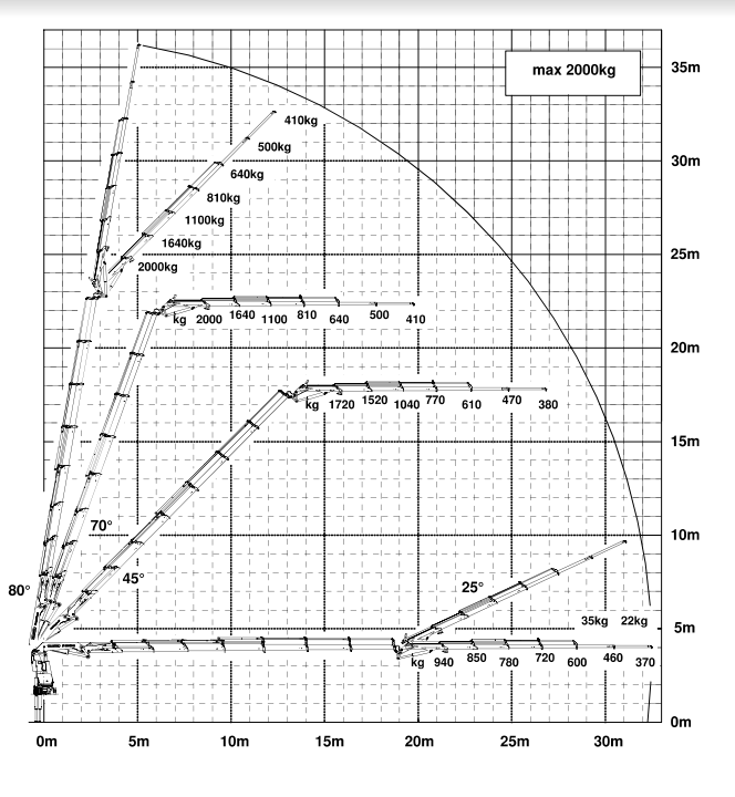 Operators benefit from intuitive remote controls that enable optimal positioning for clear visibility of the load and surrounding obstacles, enhancing precision and safety. The knuckle boom's superior motion geometry stands out, featuring a 15° up-tilt on the upper boom and 25° up-tilt on the fly jib, which allows seamless crane work under low canopies, inside buildings, or over obstacles—even at significant heights. When needed, the luffing fly jib transforms into a tower crane configuration, delivering an impressive 20m horizontal outreach up to 30m in height, with all movements possible under full load.